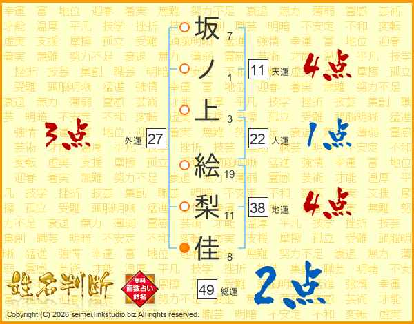 坂ノ上絵梨佳さんの総運は49画の2点!