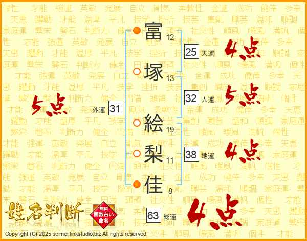 富(12画)塚(13画) 絵(19画)梨(11画)佳(8画)