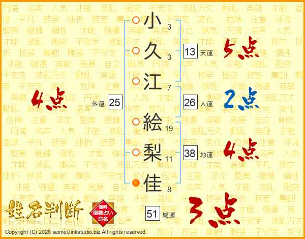 小(3画)久(3画)江(7画) 絵(19画)梨(11画)佳(8画)