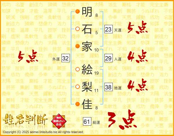 明石家絵梨佳さんの総運は61画の3点!