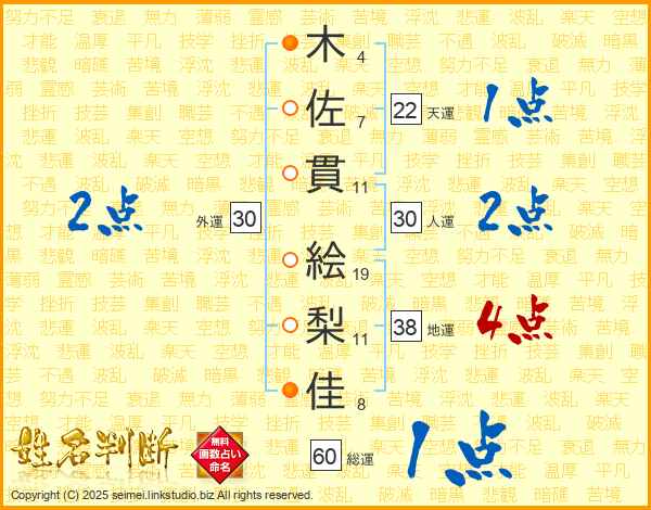 木(4画)佐(7画)貫(11画) 絵(19画)梨(11画)佳(8画)