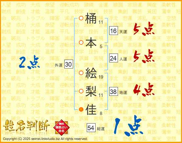 桶(11画)本(5画) 絵(19画)梨(11画)佳(8画)