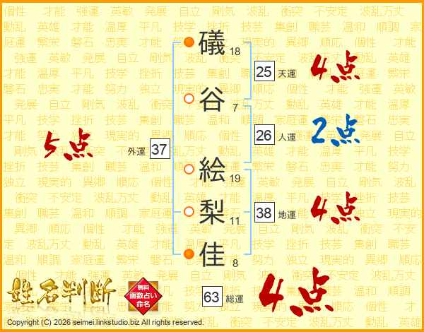 礒(18画)谷(7画) 絵(19画)梨(11画)佳(8画)
