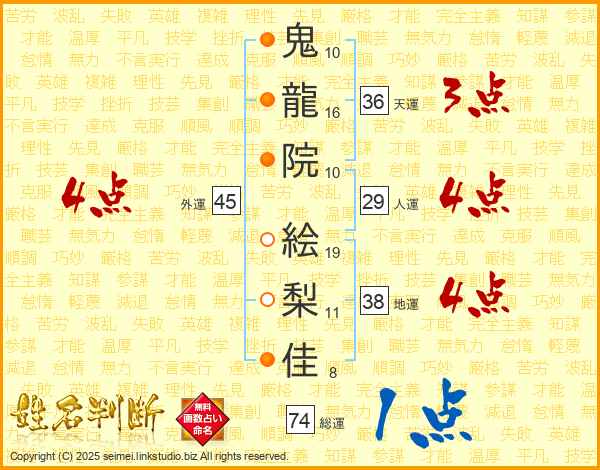 鬼(10画)龍(16画)院(10画) 絵(19画)梨(11画)佳(8画)