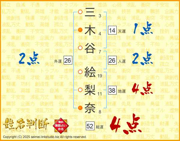 三(3画)木(4画)谷(7画) 絵(19画)梨(11画)奈(8画)