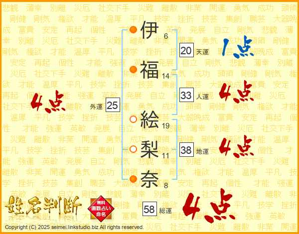 伊(6画)福(14画) 絵(19画)梨(11画)奈(8画)