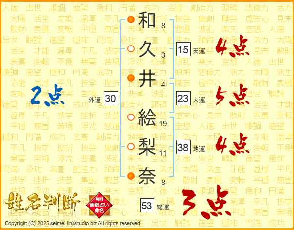 和(8画)久(3画)井(4画) 絵(19画)梨(11画)奈(8画)