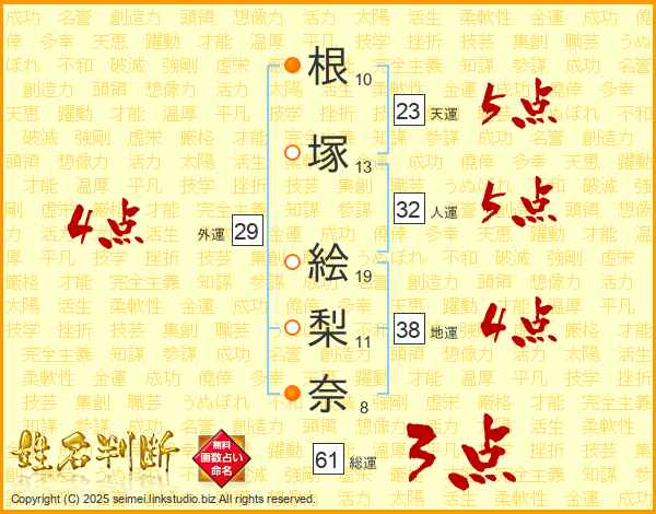根(10画)塚(13画) 絵(19画)梨(11画)奈(8画)