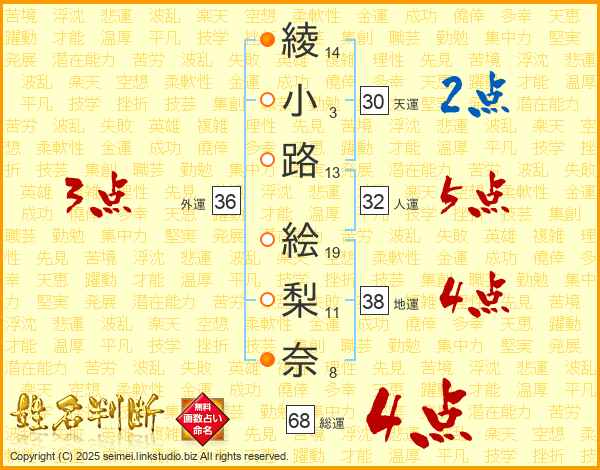 綾(14画)小(3画)路(13画) 絵(19画)梨(11画)奈(8画)