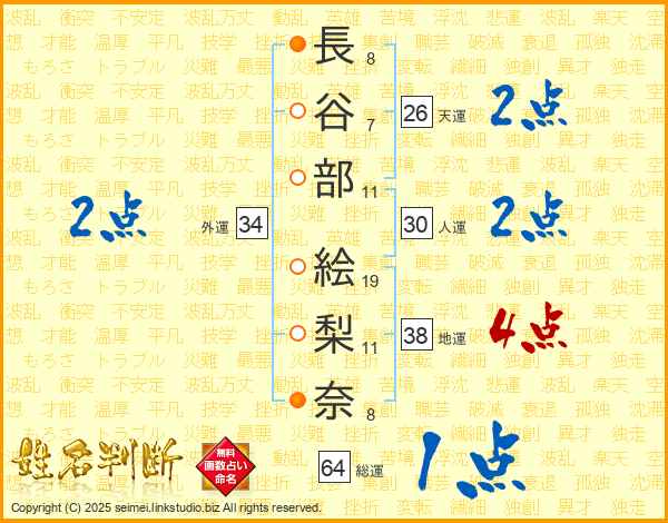 長(8画)谷(7画)部(11画)  絵(19画)梨(11画)奈(8画)