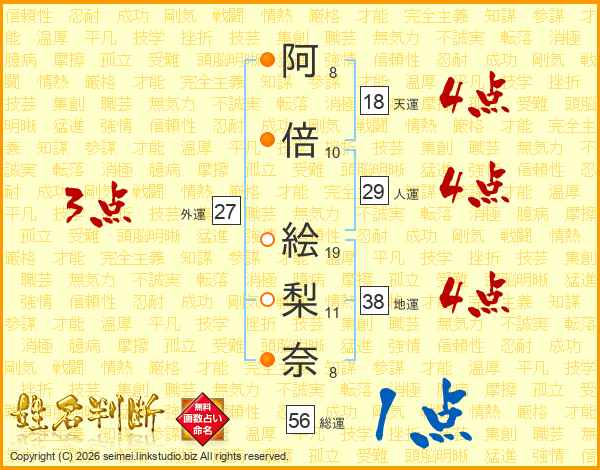 阿(8画)倍(10画) 絵(19画)梨(11画)奈(8画)