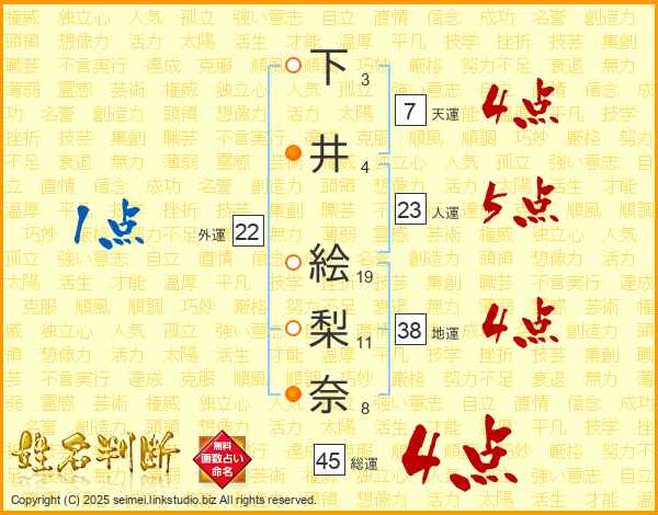 下(3画)井(4画) 絵(19画)梨(11画)奈(8画)