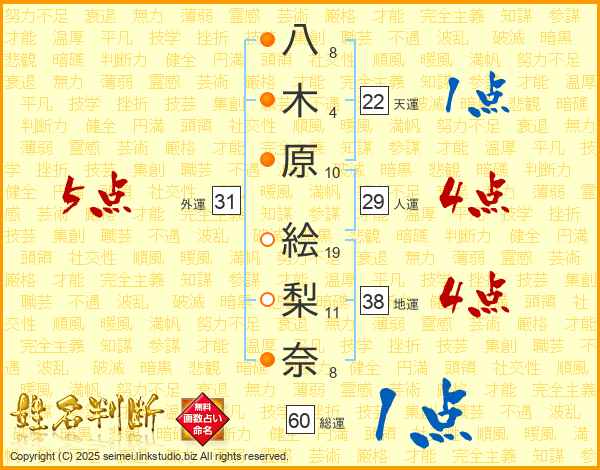 八(8画)木(4画)原(10画) 絵(19画)梨(11画)奈(8画)