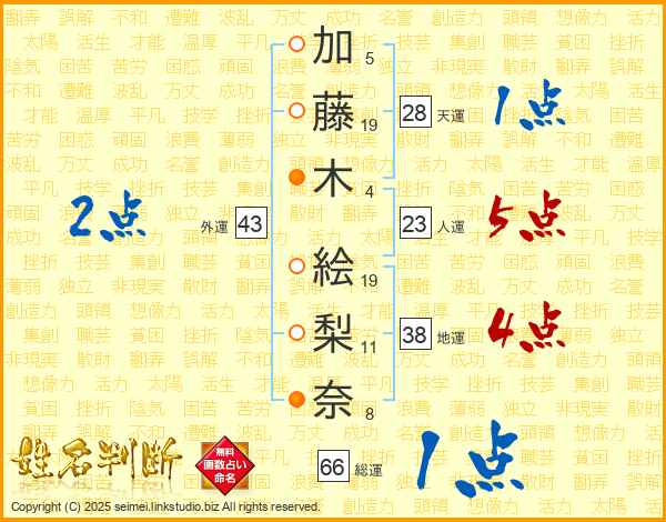 加(5画)藤(19画)木(4画) 絵(19画)梨(11画)奈(8画)