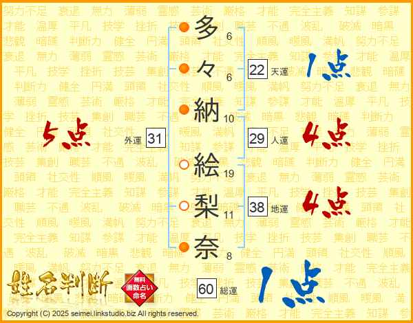 多(6画)々(6画)納(10画) 絵(19画)梨(11画)奈(8画)