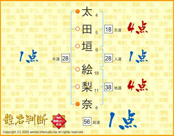 太(4画)田(5画)垣(9画) 絵(19画)梨(11画)奈(8画)