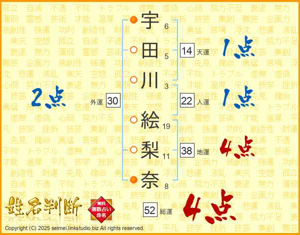 宇田川絵梨奈さんの総運は52画の4点!