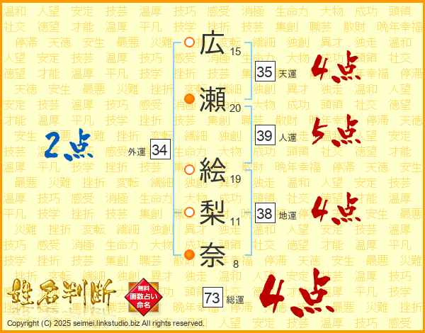 広瀬絵梨奈さんの外運は34画の2点!