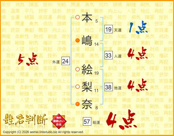 本(5画)嶋(14画) 絵(19画)梨(11画)奈(8画)
