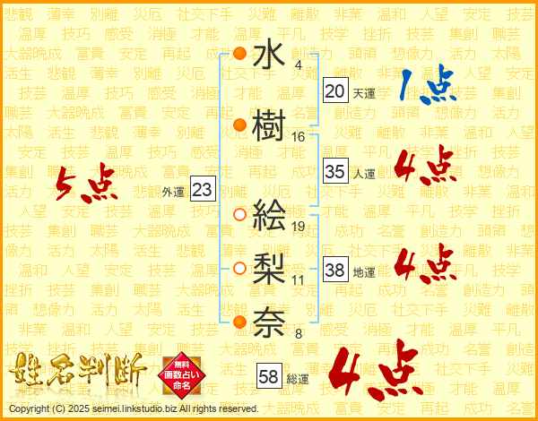 水(4画)樹(16画) 絵(19画)梨(11画)奈(8画)