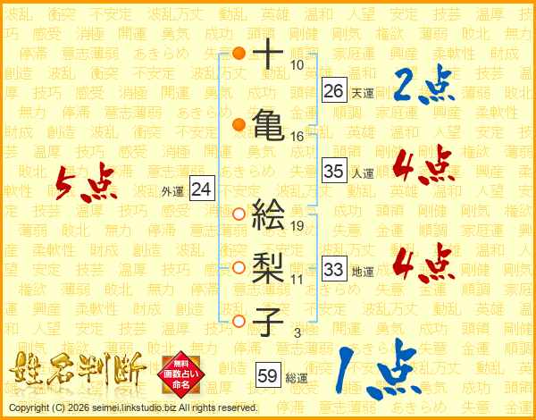 十(10画)亀(16画) 絵(19画)梨(11画)子(3画)