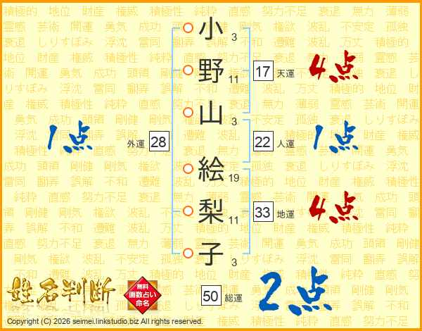 小野山絵梨子さんの地運は33画の4点!