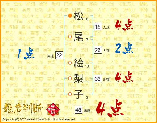 松(8画)尾(7画) 絵(19画)梨(11画)子(3画)