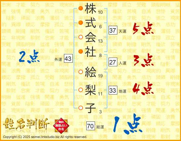 株(10画)式(6画)会(13画)社(8画) 絵(19画)梨(11画)子(3画)