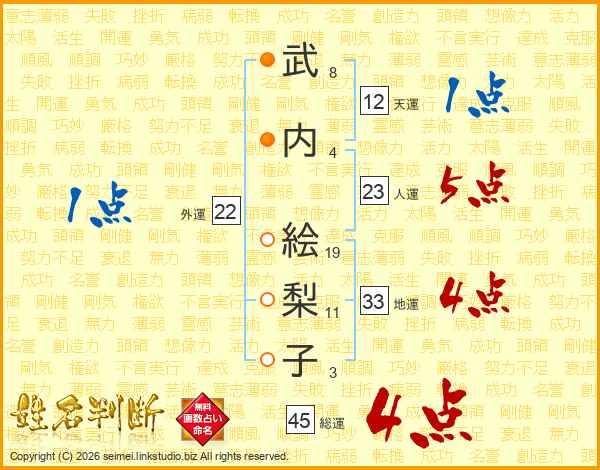 武(8画)内(4画) 絵(19画)梨(11画)子(3画)