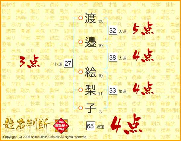 渡(13画)邉(19画) 絵(19画)梨(11画)子(3画)