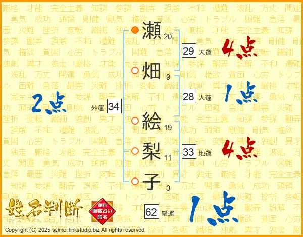 瀬(20画)畑(9画) 絵(19画)梨(11画)子(3画)