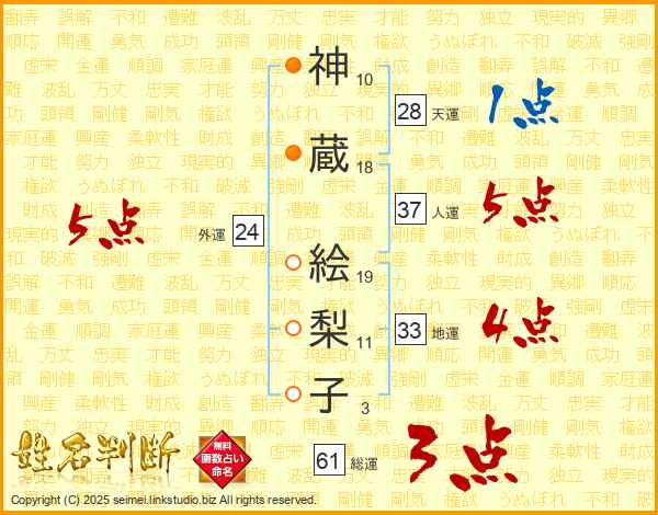神(10画)蔵(18画) 絵(19画)梨(11画)子(3画)