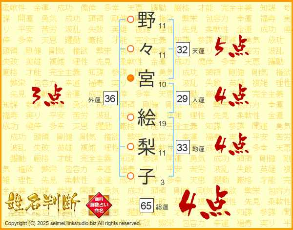 野(11画)々(11画)宮(10画) 絵(19画)梨(11画)子(3画)