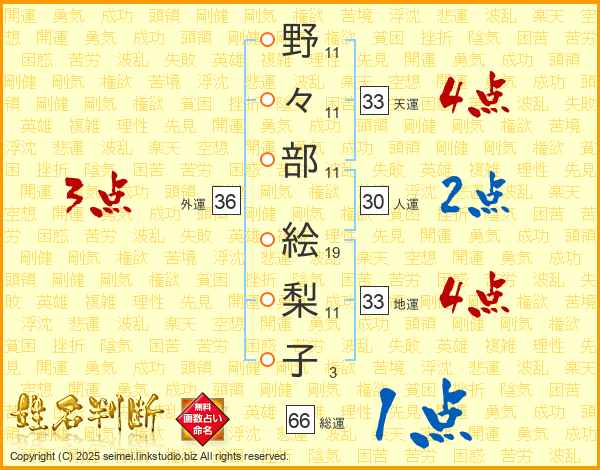 野(11画)々(11画)部(11画)  絵(19画)梨(11画)子(3画)