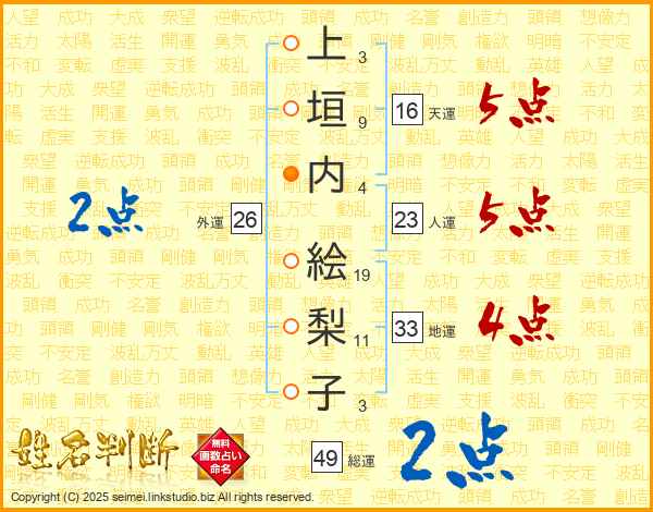 上(3画)垣(9画)内(4画) 絵(19画)梨(11画)子(3画)