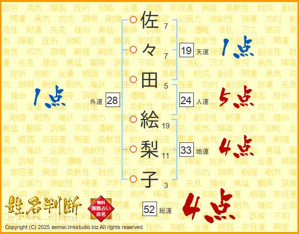 佐(7画)々(7画)田(5画) 絵(19画)梨(11画)子(3画)