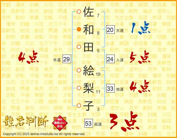 佐(7画)和(8画)田(5画) 絵(19画)梨(11画)子(3画)