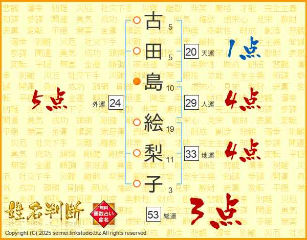 古(5画)田(5画)島(10画) 絵(19画)梨(11画)子(3画)
