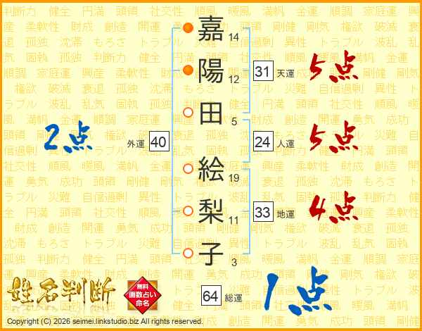 嘉陽田絵梨子さんの天運は31画の5点!