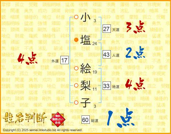 小(3画)塩(24画) 絵(19画)梨(11画)子(3画)