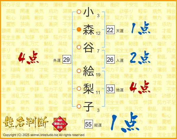 小(3画)森(12画)谷(7画) 絵(19画)梨(11画)子(3画)