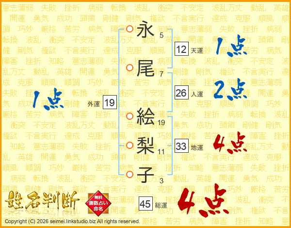 永(5画)尾(7画) 絵(19画)梨(11画)子(3画)