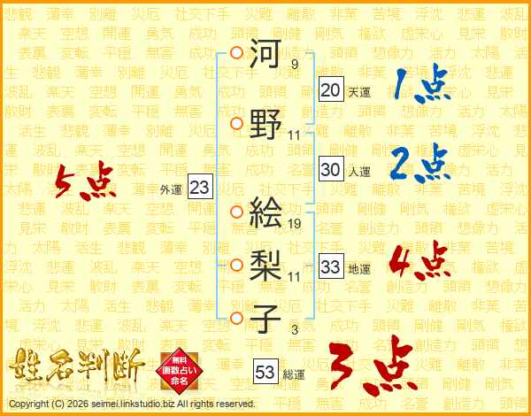 河(9画)野(11画) 絵(19画)梨(11画)子(3画)