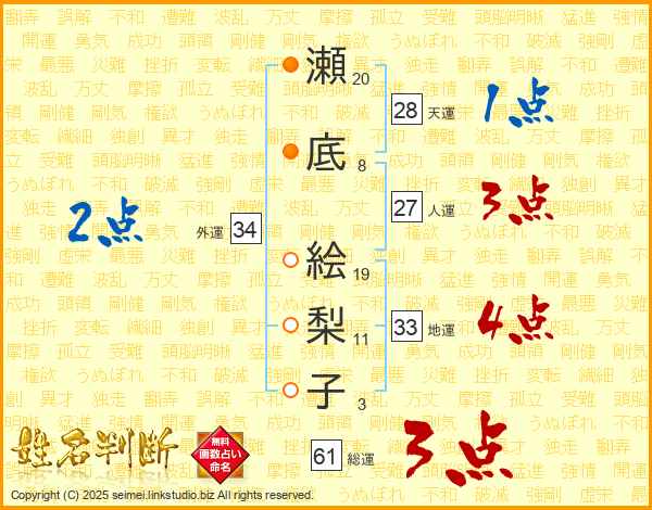 瀬(20画)底(8画) 絵(19画)梨(11画)子(3画)