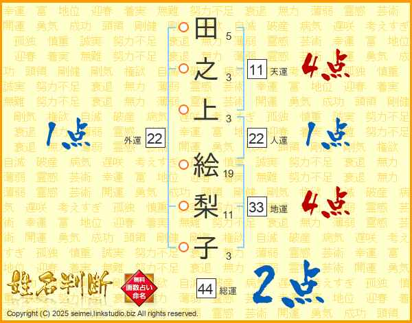 田(5画)之(3画)上(3画) 絵(19画)梨(11画)子(3画)