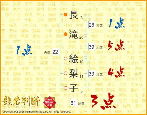 長(8画)滝(20画) 絵(19画)梨(11画)子(3画)