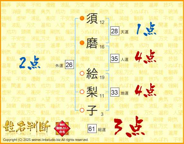 須(12画)磨(16画) 絵(19画)梨(11画)子(3画)