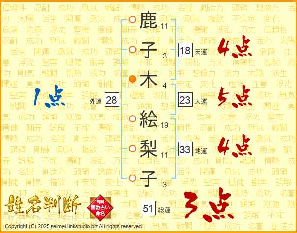 鹿(11画)子(3画)木(4画) 絵(19画)梨(11画)子(3画)