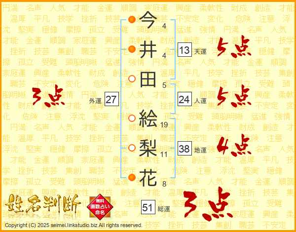 今(4画)井(4画)田(5画) 絵(19画)梨(11画)花(8画)