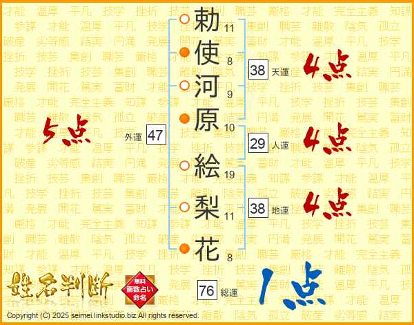 勅(11画)使(8画)河(9画)原(10画) 絵(19画)梨(11画)花(8画)